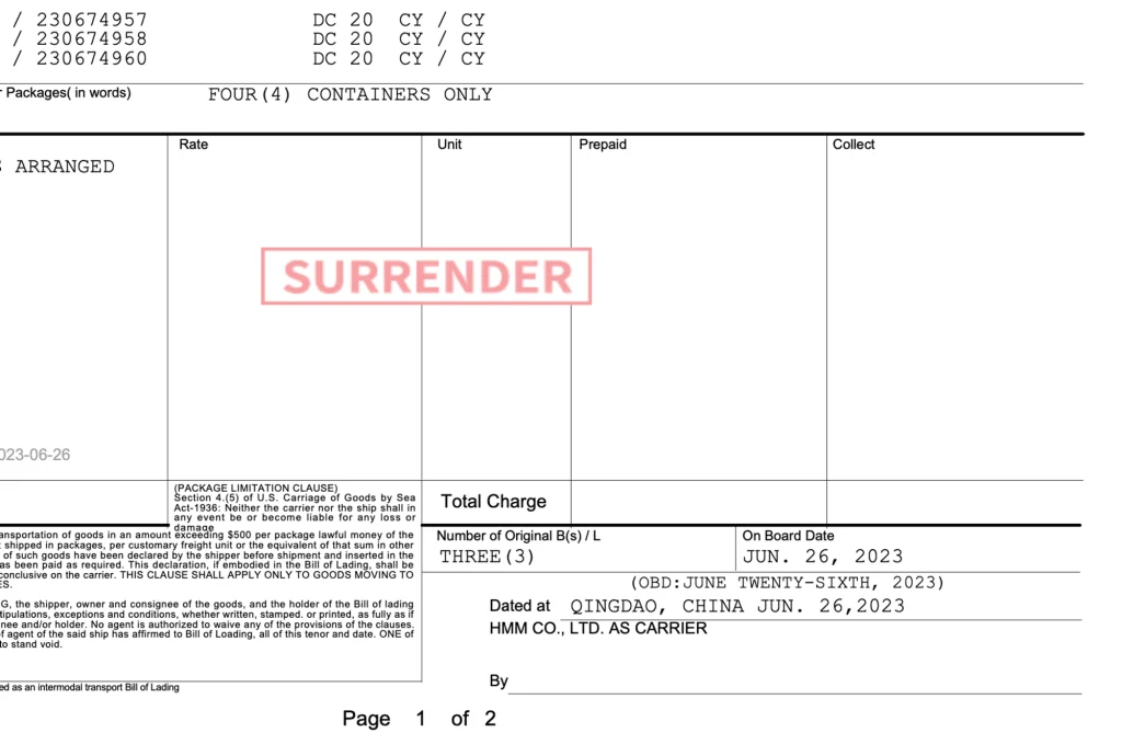 3. Surrendered Bill of Lading (B/L Surrender)