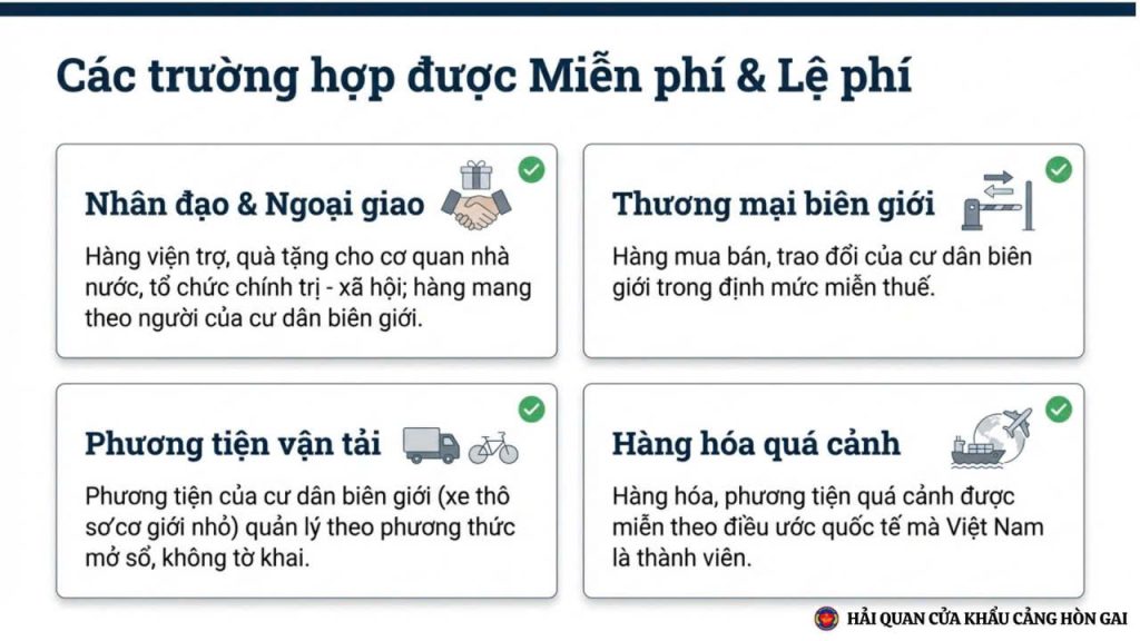 Miễn phí hải quan và lệ phí hàng hóa, phương tiện vận tải quá cảnh đối với tổ chức, cá nhân thực hiện thủ tục hải quan xuất khẩu, nhập khẩu, quá cảnh hàng hóa, xuất cảnh, nhập cảnh, quá cảnh phương tiện vận tải trong các trường hợp sau: